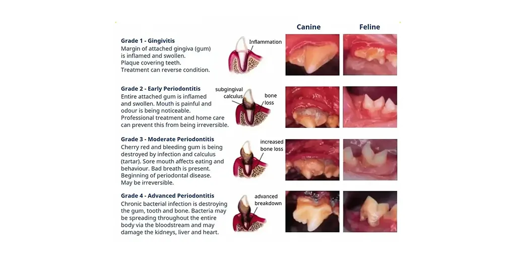 Below or Above, a chart outlines the different levels or grades of dental disease progression in dogs (canines) and cats (felines). By staying current on annual dental exams and cleanings, you can help prevent advanced dental disease and keep your pets “all smiles”.